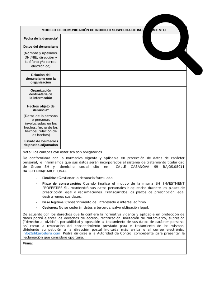Conformément à la réglementation en vigueur et applicable en matière de protection des données à caractère personnel, nous vous informons que vos données seront incorporées dans le système de traitement appartenant au Groupe Sh et ayant son siège social à CALLE CASANOVA 99 BAJOS, 08011 BARCELONA (BARCELONA).